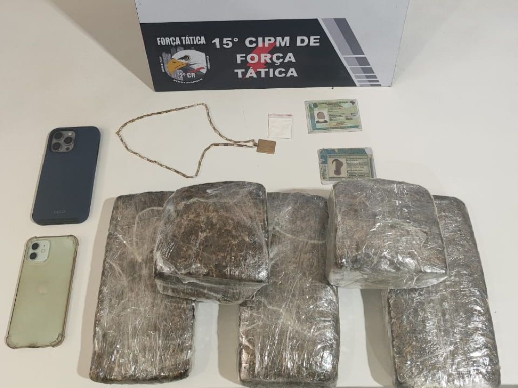 Já na verificação ao veículo, os policiais encontraram uma porção de cocaína, dentro do carro. Na continuidade das buscas, a equipe localizou cinco tabletes de maconha, no porta-malas do automóvel.
