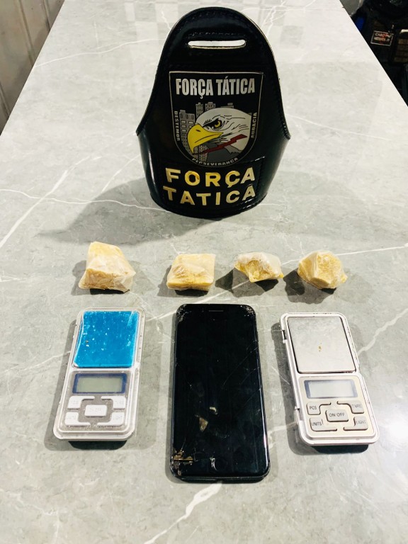 Após alguns metros de acompanhamento, o veículo foi interceptado, e o suspeito abordado. Com o jovem, nada de ilícito foi encontrado. Já no interior do Honda Fit, os policiais encontraram quatro porções de pasta base de cocaína e duas balanças de precisão.