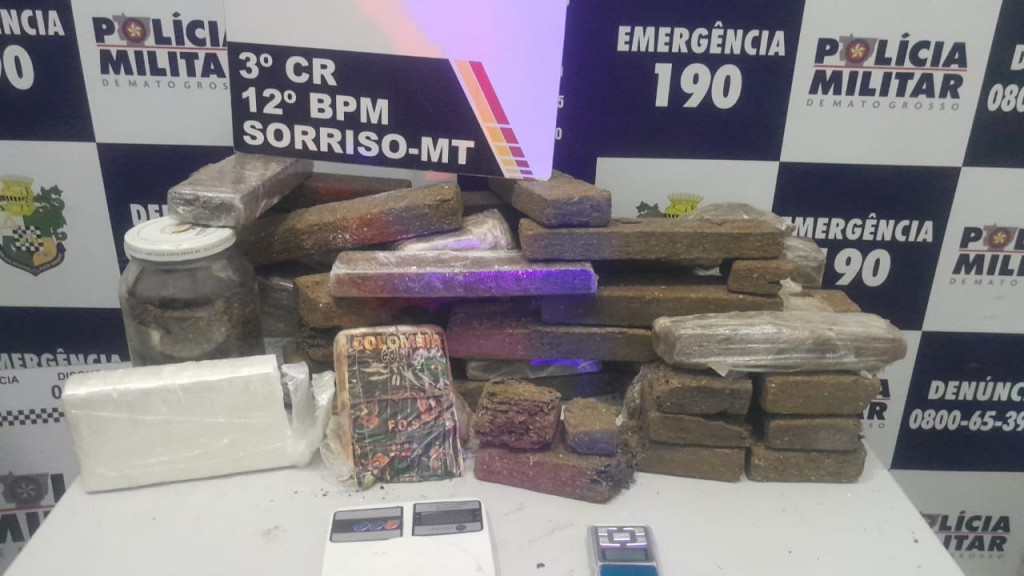 Policiais militares do 12º Batalhão apreenderam, na noite desta quarta-feira (02.10), 33 quilos de entorpecentes entre maconha e cocaína, em uma residência no bairro Morada do Bosque, em Sorriso (396 km de Cuiabá). Na ação, um homem, de 21 anos, foi preso em flagrante por tráfico ilícito de drogas.